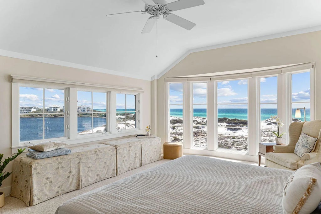 This rare top-floor end unit at The Crossings at WaterSound Beach is all about the views. Wake up in the primary suite, raise the remote-controlled electronic window treatments and take in stunning views of Camp Creek Lake and the Gulf of Mexico through two walls of windows including a magnificent floor-to-ceiling bay window. Views of the lake and shimmering Gulf of Mexico are equally breathtaking from the living room, kitchen, dining room and second bedroom. Wood flooring and feature windows enhance the stunning sitting room which shares the panoramic vista with the dining room and kitchen. The kitchen has a full range of wood cabinets, stainless steel appliances and granite countertops for smoothly preparing tasty snacks and gourmet meals.