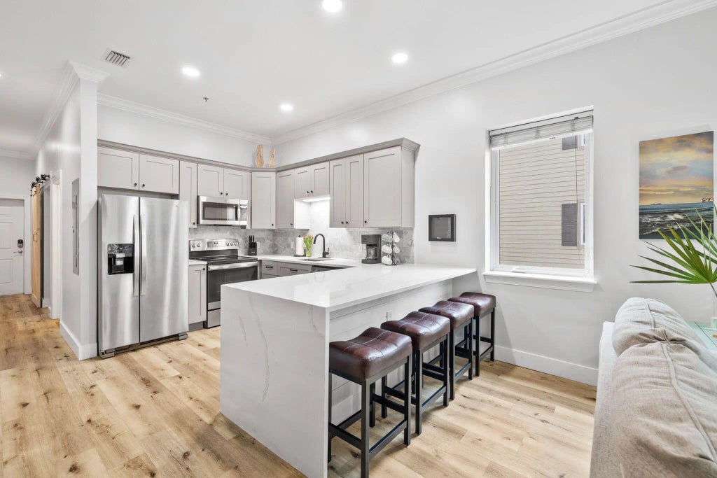 Offering a professionally curated design, this gorgeous three-bedroom end-unit in the heart of Seagrove Beach is the epitome of private coastal living. Upon initial approach, the welcoming entry way adorned with white oak styled LVP flooring leads way to the freshly remodeled kitchen and living area. The impressive kitchen features new cabinetry flanked with white quartz countertops with a waterfall edge, ample storage, new appliances, and an extended island perfect for entertaining. The seamless transition to the screened-in balcony is the perfect place to admire the new palate of mesmerizing hues emitted by the renowned Emerald Coast sunsets each night while simultaneously listening to the waves crashing onto shore in the distance.Synonymous with relaxation, the spacious main suite is a true oasis boasting a seating area and dual wardrobes. The sumptuous ensuite features dual vanities, and a walk-in shower with a separate soaking tub. A junior suite and bunk room with trundle share a full bath and are located just down the hall.