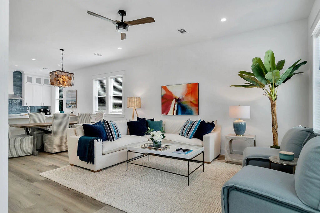 This home is situated on a private lot which backs up to a nature preserve. Wetlands on the left side prevent another home from being built for additional privacy. There is room in the back to build a pool and a large deck. Features include 4 bedrooms/4.5 baths with a bedroom on the first floor. The custom bunk room has 2 queens and 4 twins making a desirable rental. Treetop Village is a gated community with direct access to Hwy 98 and 30A. Perfectly located between Alys and Rosemary Beach and walking distance to the shops and restaurants. Treetop has deeded beach access and tram service to the beach.