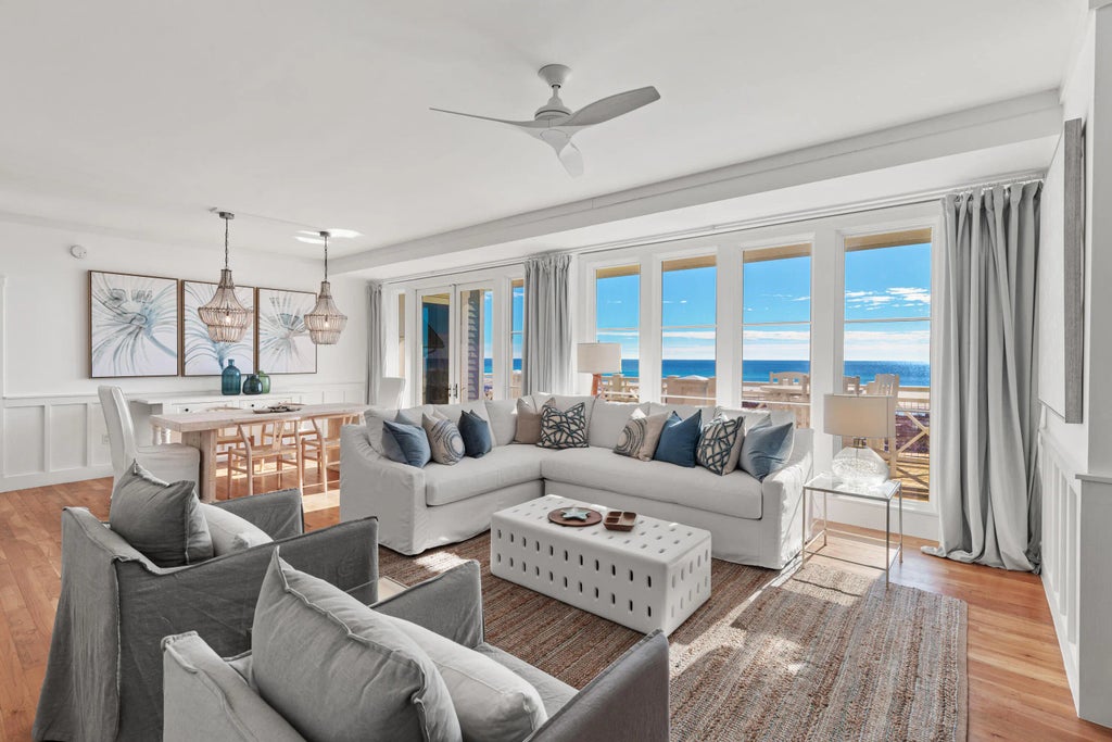 Upon entering, expansive views greet you while you soak in an airy, vast open living and dining area, complemented by new designer furnishings that set the tone for elegant gatherings. The living area seamlessly extends to a spacious balcony, offering tranquil views of turquoise water and protective natural coastal dunes, perfect for enjoying Florida's stunning sunsets.